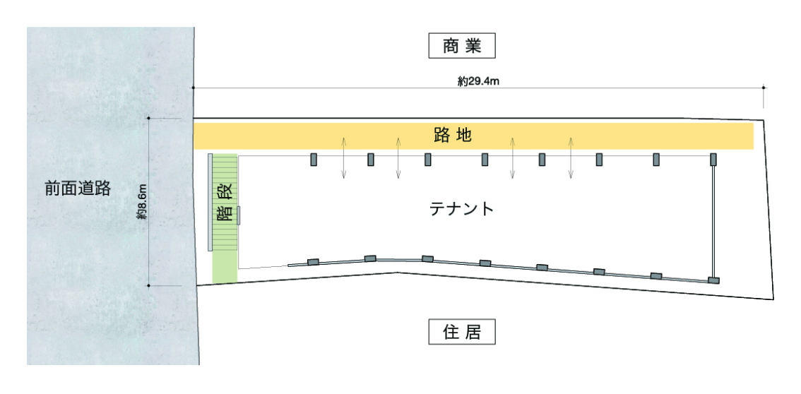 MAT うん。正面に階段を持ってくるというのは、人の動きが見える点では面白いところだと思うんですけど、一方でちょっとテナントビルとしての開き方が気になったところもあって。それを補完するために、北側にもう一つの代官山の特徴であるような「路地」を持ってきて、そっちには思う存分開こうというようなことを考えましたよね