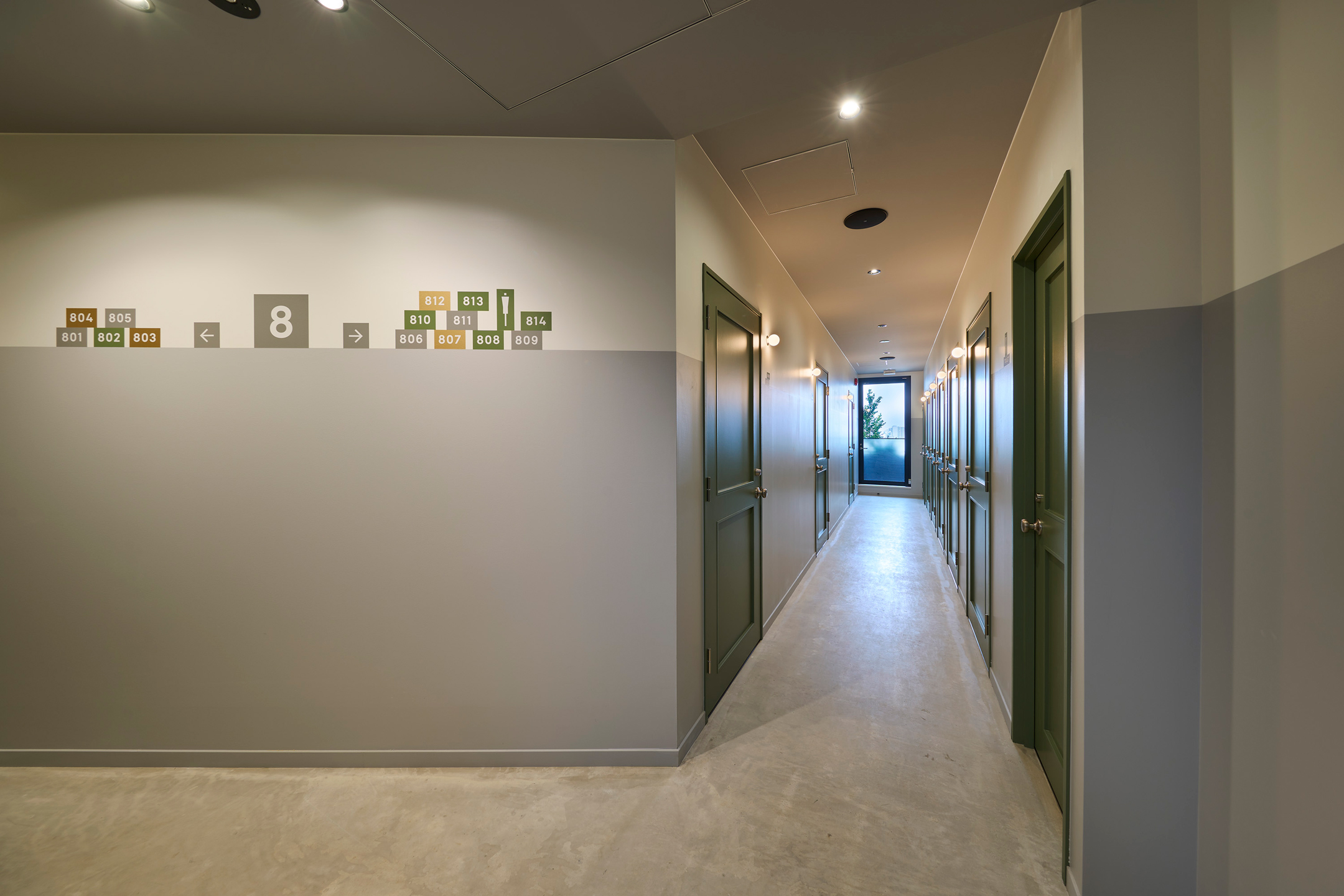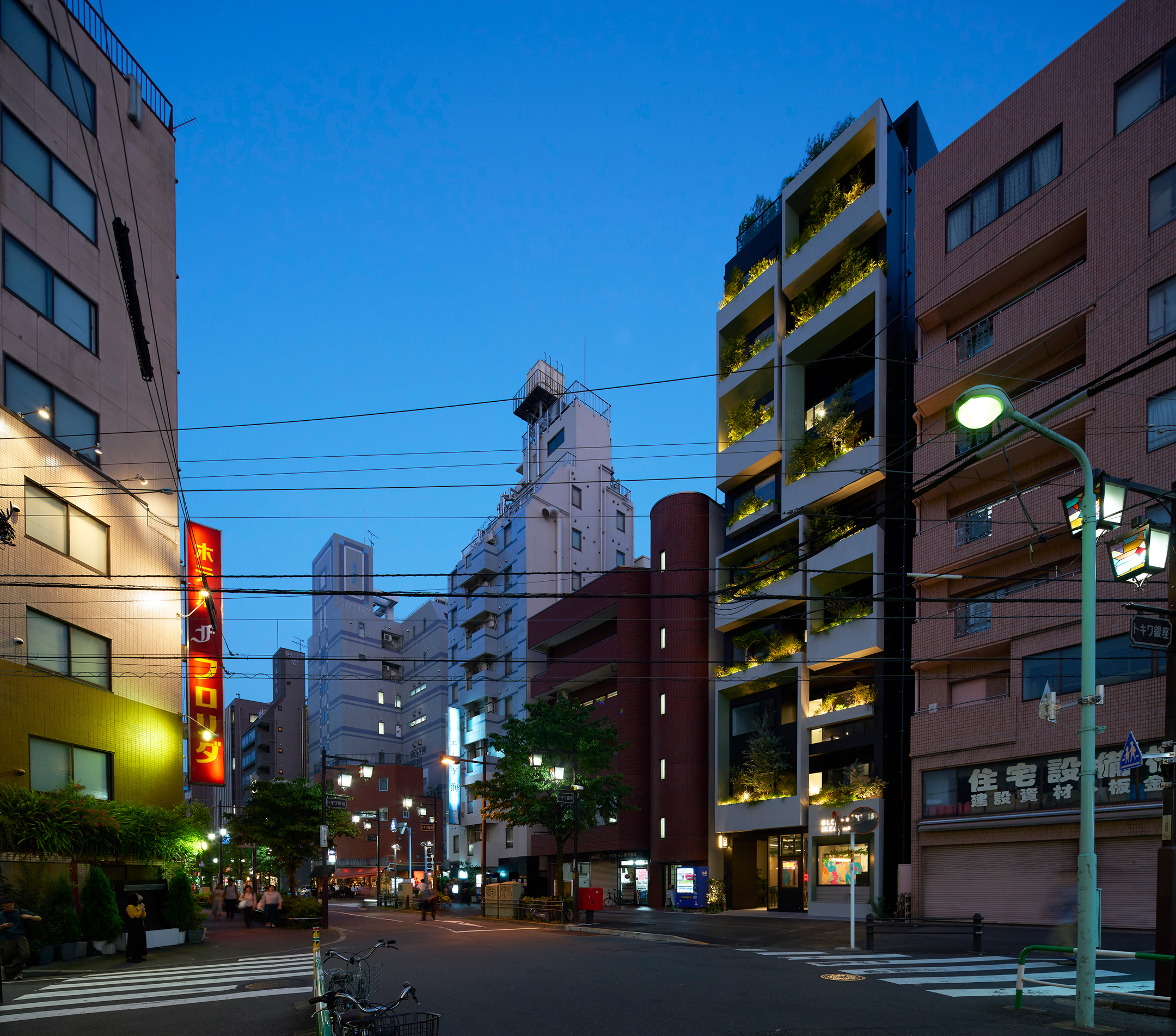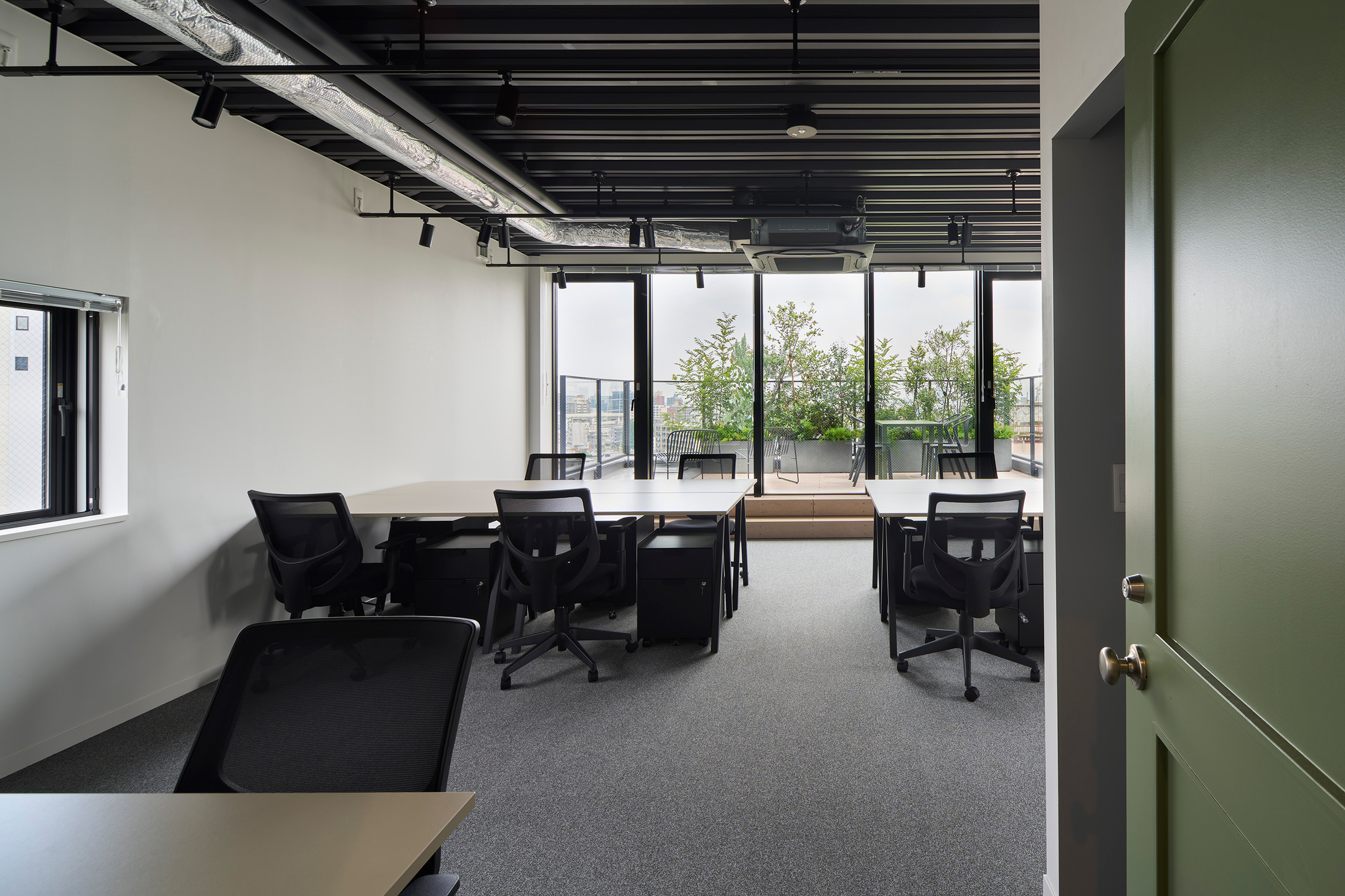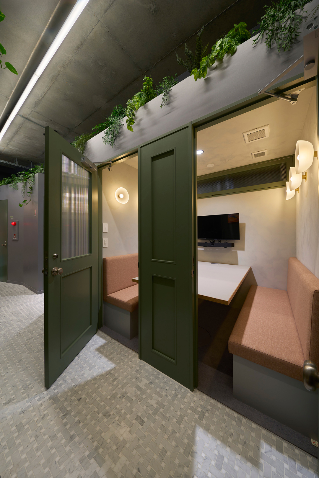 1人~6人用の様々なタイプの個室が100室ほど、みっちりと詰まっているシェアオフィスです。そのため、柱型を最小限に押さえた薄肉ラーメン工法を採用しました。個室内に柱型が出る事はなく、より効率的に個室と座席を確保する事が可能となります。加えて、この工法により構造的な制約から解放されたファサードには、街に潤いと風情を与えるべく、プランターを立体的に配し、グリーンを展開させています。このグリーンは、室内(シェアオフィス個室の一部)にも享受させていて、内外のバッファーになりつつ、街とオフィス空間を接続しています。無愛想な街に、少し愛嬌のあるキャラクターが誕生しました。