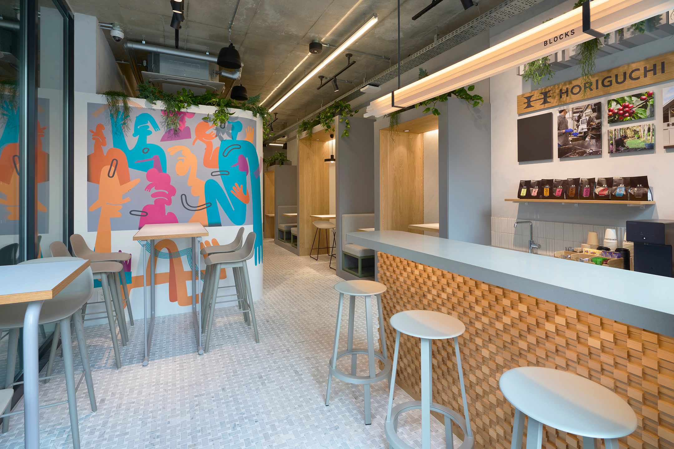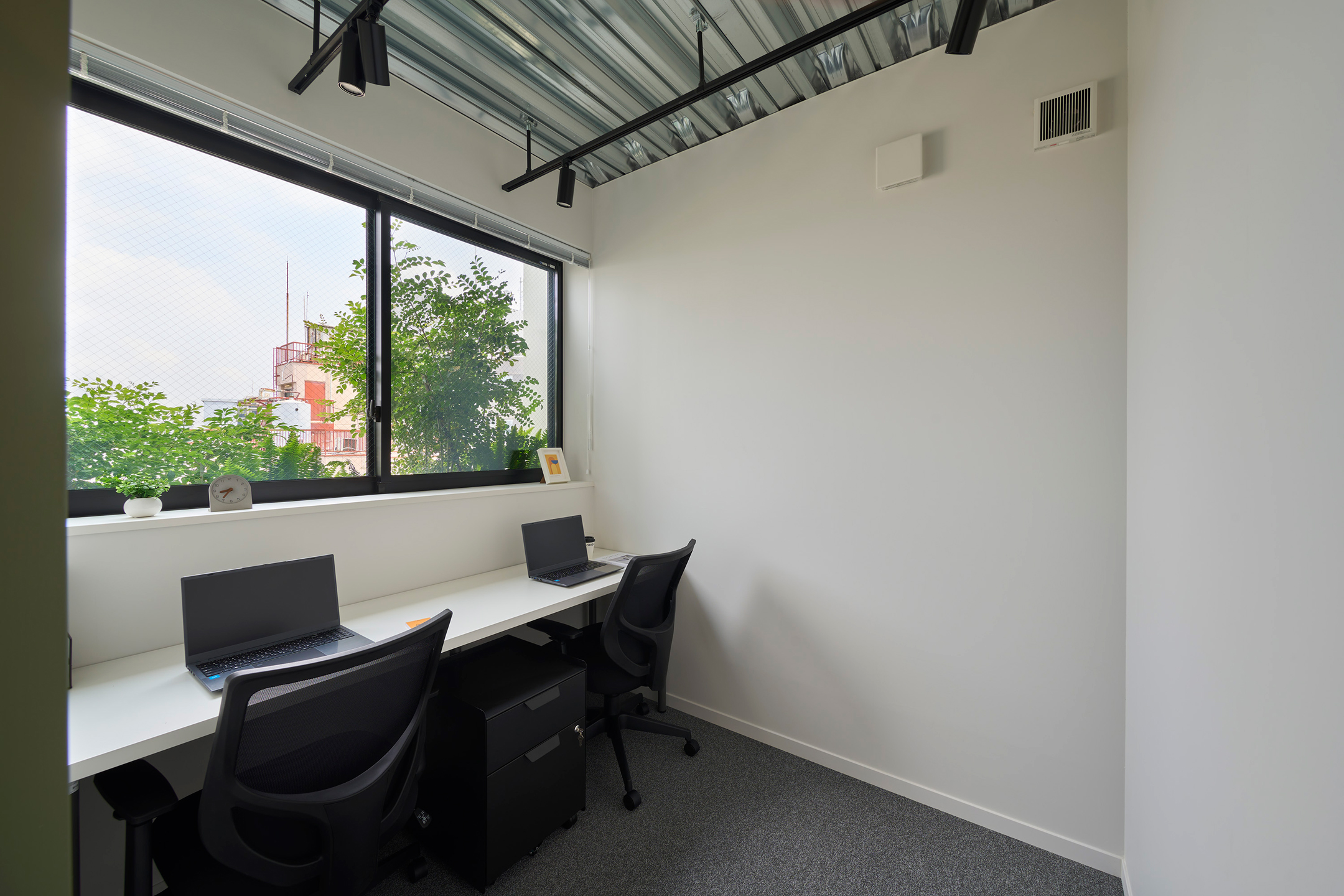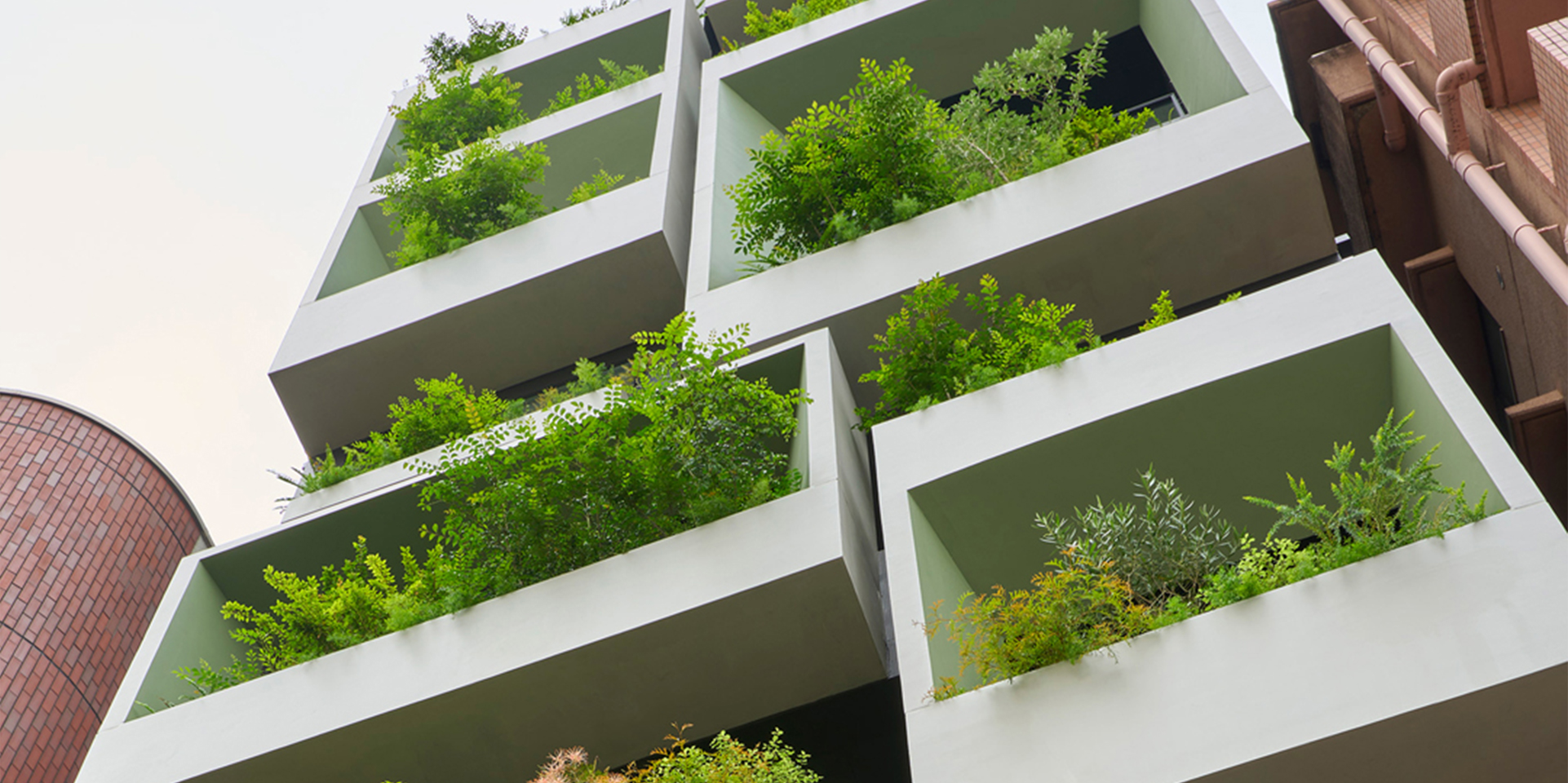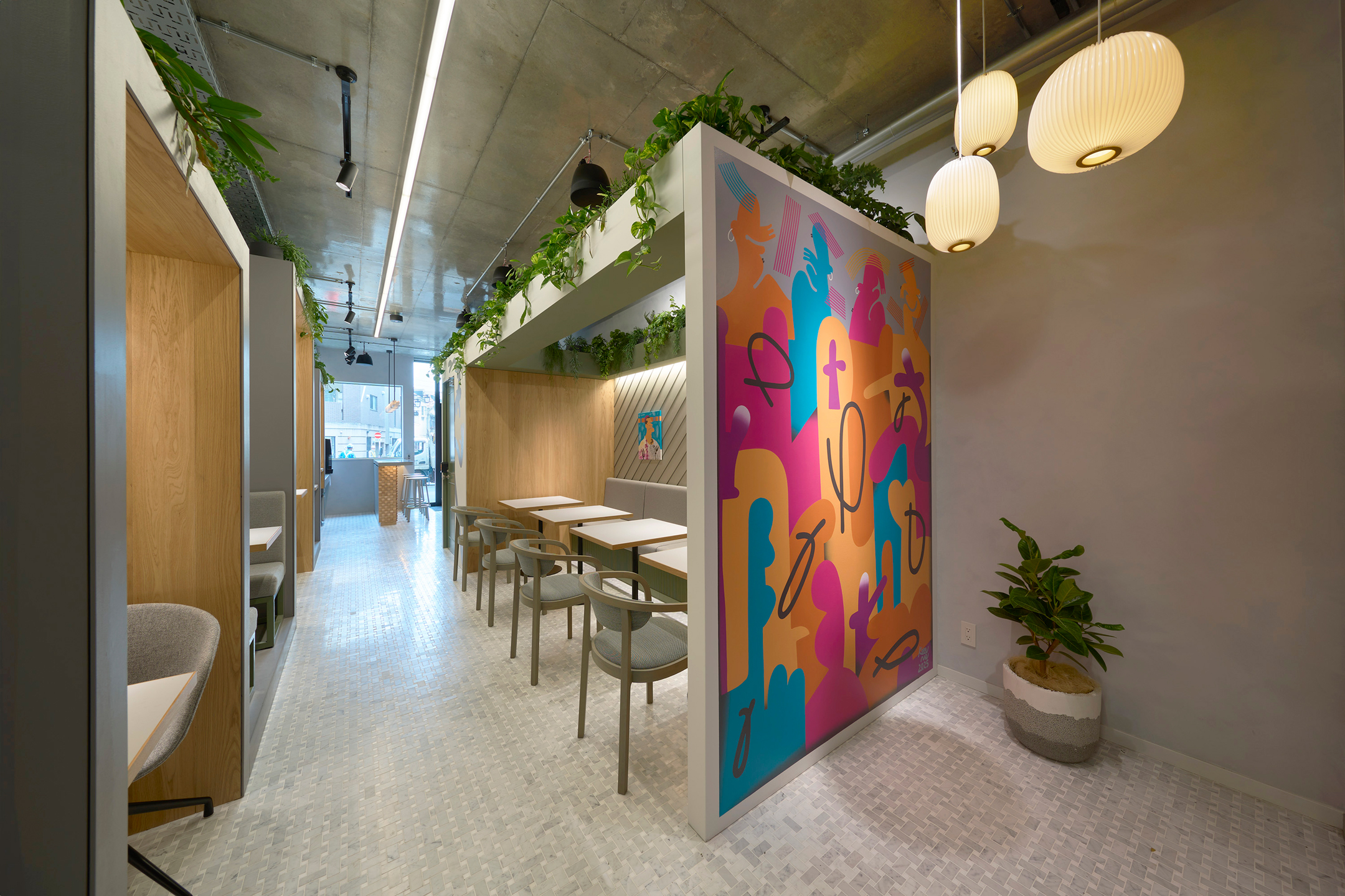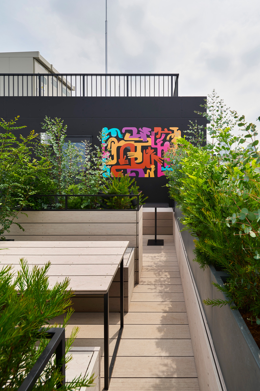 1人~6人用の様々なタイプの個室が100室ほど、みっちりと詰まっているシェアオフィスです。そのため、柱型を最小限に押さえた薄肉ラーメン工法を採用しました。個室内に柱型が出る事はなく、より効率的に個室と座席を確保する事が可能となります。加えて、この工法により構造的な制約から解放されたファサードには、街に潤いと風情を与えるべく、プランターを立体的に配し、グリーンを展開させています。このグリーンは、室内(シェアオフィス個室の一部)にも享受させていて、内外のバッファーになりつつ、街とオフィス空間を接続しています。無愛想な街に、少し愛嬌のあるキャラクターが誕生しました。
