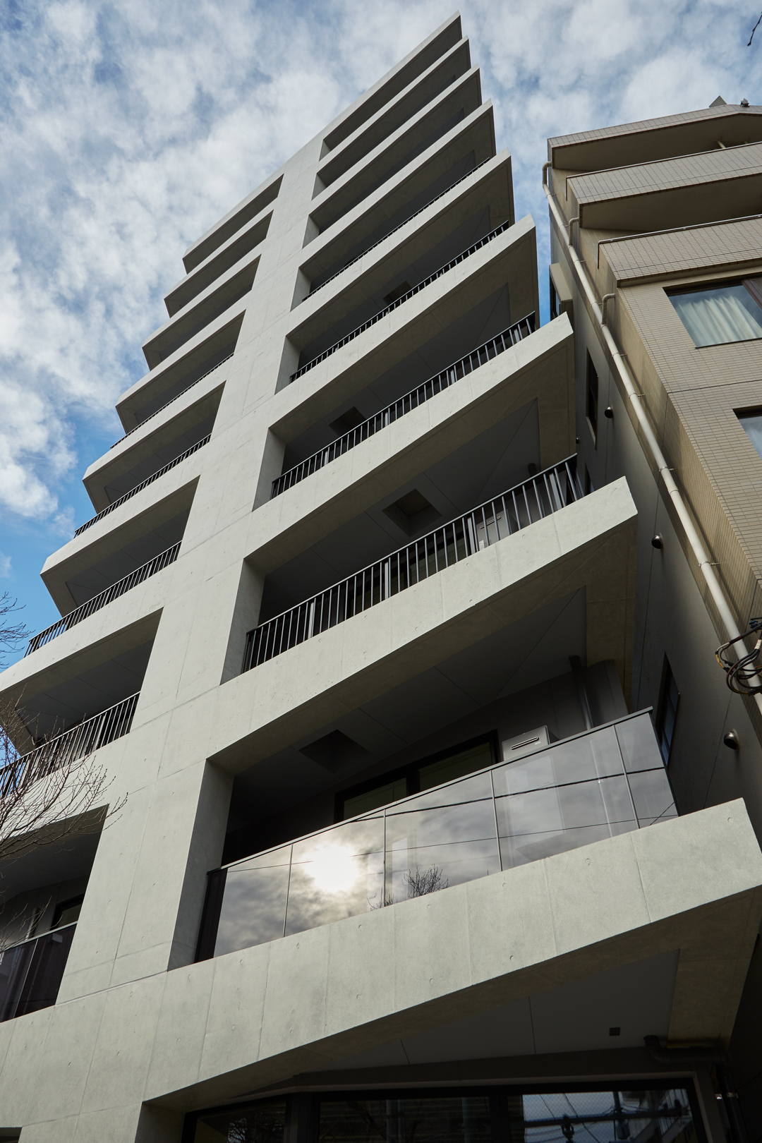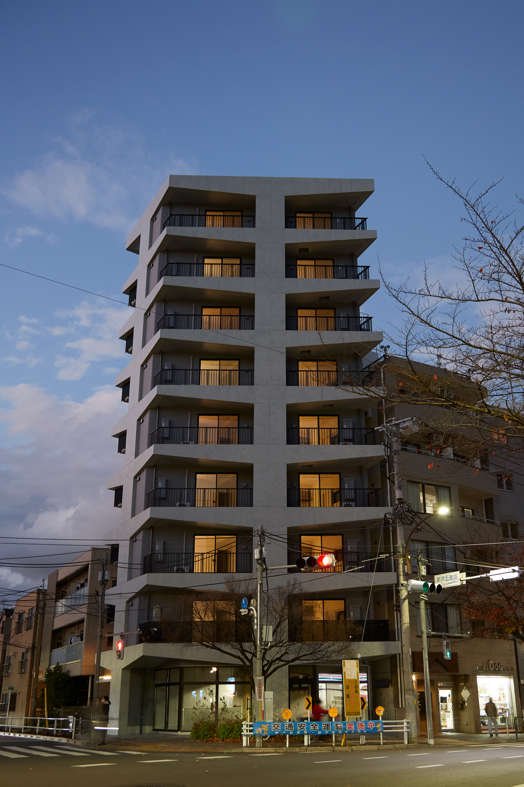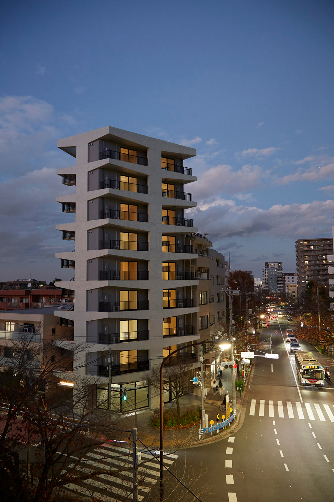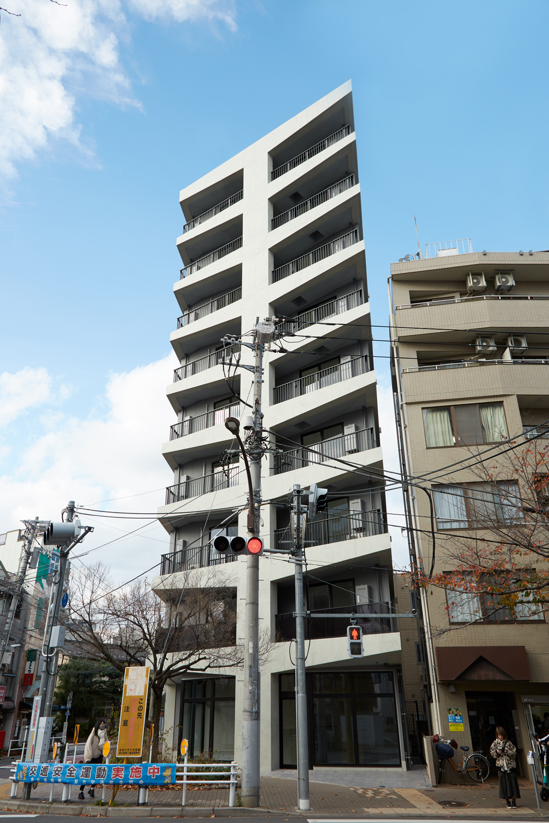 中野区の新井薬師付近の五差路に面する高層ワンルームマンションです。周辺は低中層の建物が混在している住宅街で交通量の多い中野通りや名刹新井薬師、大きな公園もあり、一定数の賑わいが感じられる地域です。敷地の南面に五差路の中心が位置しており、直線的な道路を介して大変見通しの良い立地で建物が立ち上がれば、歩道の桜の木と併せてこの地における象徴的な風景になると容易に確信が持てるような場所でした。